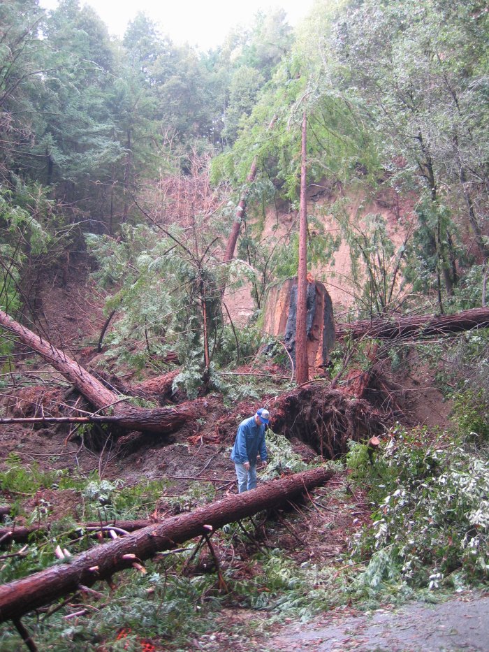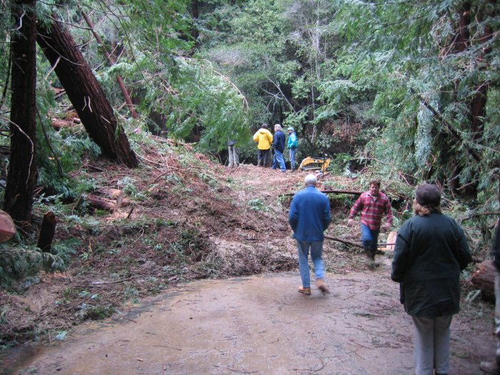 Here's Pa (middle of pic) walking across the back side of the slide. The guy to the right is on the road. People had chainsaws going already. It was quite the community event. Chainsaws, shovels, backhoes. Sari and Peter were helping by attaching chains to some of the cut redwood logs so another neighbor could winch them out of the way using his truck.