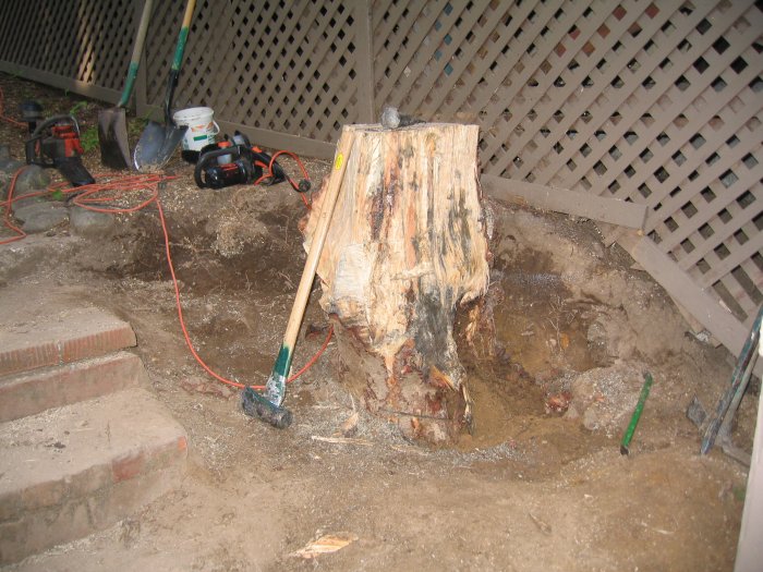 And here's an update of the stump project. I couldn't do to much because I had too much pain in my hands from blisters. I was using a sawzall to try and get the roots cut, but the blade kept getting stuck. The wood was so hard and would compress back against the blade, which made the sawzall go back and forth in my hands. Sometimes it shook my whole body. Eventually we used a chainsaw, but even that was hard going.