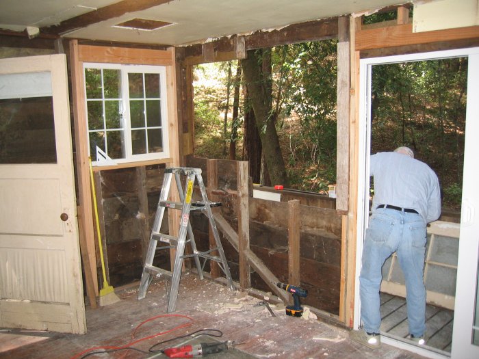 5-11-08. More pictures of the Pumphouse. Here we're starting demo of the second window. It's single paned and in the wrong location, so out it goes. We cut a new hole for the new window closer to the corner of the room.